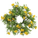 Evening Primrose Bush is a spring candle ring that features yellow flowers, green leaves, and a plastic green base. Ring has plastic stems and a flat plastic base and it can be displayed freestanding on flat surfaces or mounted on a wall or door like a wreath. Ring is great for accenting a variety of candles and it measures a 3" inner diameter and a 10" outer diameter.