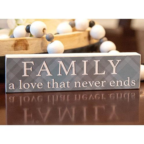 Family A Love That Never Ends Plaid Block has distressed white edges and a subtle plaid background in teal and gray. The phrase, "Family a love that never ends," appears in white, lightly distressed text. This block is the perfect choice for decorating shared spaces in the home. It will look great on shelves, tables, trays and more. Measures 1.5" high by 6" wide and 1" deep.