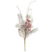 The Frosty Pines & Berries Pick is a decorative floral pick with a flexible, brown-wrapped stem. The pick is filled with pine greenery, red berry clusters, and rustic pinecones, all finished with a coat of thick white flocking for a fresh snowfall effect. Display this pick inside of a vase or pitcher to dress up the home with a festive woodland look during the Winter and Christmas season. Measures 15” long.