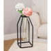 Thin Glass Tube Vase with Metal Frame has a flat base for freestanding display and features a sleek black metal frame with a thin glass vase in the center. It looks great on tabletops, mantels, or bookshelves and is perfect for housing florals. Measures 8.25" high by 2.25" in diameter and Frame is 9.5"