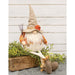 The Harvest Farmer Gnome is a plush autumnal gnome sitter covered in orange plaid fabric and corded cream overalls with wooden buttons. The gnome features taupe fabric shoes, as well as a pointed burlap hat adorned with jute rope and a knit pumpkin, and holds a metal rake. The gnome has a weighted bottom to ensure a secure display, as well as dangling fabric legs. Display this gnome on any shelf or tabletop during the Fall season. Measures 24.25" high by 8" wide by 4" deep.