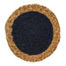 The Jute Cotton Candle Mat is a decorative round tabletop mat made of thick, woven jute material in a braided pattern. The center of the mat is navy-blue, surrounded by a natural tan border. Display this mat year-round, topped with a candle and candle ring, and placed on a table or countertop space. Measures 6.75" in diameter.