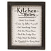 The Kitchen Rules Frame is a decorative sign with a white background, black stitchery border, and a distressed black wood frame. The sign reads “Kitchen Rules – wash your hands – Clean up after yourself – Eat something green – Put the phone down – Shut the fridge door – Help wash the dishes – Be thankful for every meal” in black lettering. This sign makes a heartwarming accent to any kitchen space, displayed on a wall using the sawtooth hanger or freestanding on a shelf or table. Measures 10” high by 8” wide by .75” deep.