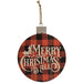 Merry Christmas Buffalo Check Bulb Sign is a wooden sign with a Christmas bulb shape. Sign has a red and black, buffalo check background that displays that phrase, "Merry Christmas to All," in lightly distressed, ivory colored lettering. The top of the sign is accented with a corrugated metal cap. Sign hangs on a jute rope cord. Measures 15.75" high by 13.75" wide and .5" deep.