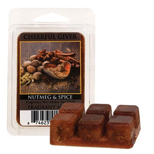 Nutmeg Spice Wax Melts is a hand-poured, soy wax melt that features notes of fire roasted almonds with spicy clove and nutmeg. Melts are made with vegan, dye-free wax that is sprinkled with assorted botanicals and poured into a plastic clamshell container. Melt consists of 6 cubes measuring 2.75 ounces in total. Made in the USA.