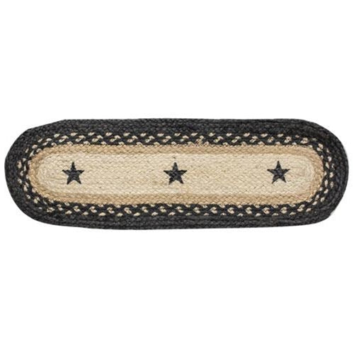 Primitive Pewter Star Braided Stair Tread is made from 100% jute and features woven fibers in blue, beige, and cream colors. The fibers are tightly woven and stitched together in alternating bands and it is accented with 3 appliqued blue stars. Measures 27.5" wide by 8" high. Care instructions: Do not machine wash. Spot clean with mild soap and water.