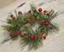 Red Berry Pine ring is brushed pine branches intermixed with ivy-like pieces and metallac burgundy berries. Mini pinecones and small rusty jingle bells accent this 8" outside diameter and 3-1/2" inside diameter wreath.