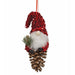 The Sequin Gnome Pinecone Ornament is a decorative plush gnome figurine with a fuzzy white beard and red sequin shirt and hat. The bottom of the gnome is a rustic pinecone complete with white snow detailing. The top of the ornament includes a red ribbon hanger to use for display, bringing a whimsical woodland touch to a Christmas tree during the holiday season. Measures 11.5” high by 3.5” wide by 3” deep.