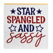 The Star Spangled and Sassy Block brings a playful touch to summer or everyday Americana displays. Made from wood, the square block features a white painted front and an unfinished back and edges. A lightly distressed finish gives the block a more rustic look. Bold text in blue and red hues reads “star spangled and sassy” across the sign in a mix of script and print fonts. Blue stars in 2 different styles accent the block. Measures 6” high by 6” wide by .75” deep.