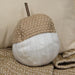 The Tan White Knit Acorn is a decorative plush in the shape of an autumnal acorn. The acorn is made of cream cable-knit fabric, featuring woven jute rope material at the top, along with a sturdy twig stem. This acorn is a rustic and cozy addition to Fall home decor, and can be displayed among throw pillows, used as decorative bowl filler, or propped upon a shelf or tabletop. Measures 7" high and 4.5" in diameter.