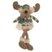 The Teal Dangle Leg Nordic Sweater Reindeer is a stuffed plush decor piece for cozy Christmas displays. With a textured brown fabric finish, the reindeer has a wide snout and felt antlers. Black bead eyes, a brown pom nose, and an embroidered mouth give the reindeer a friendly face, and his long legs can drape over the edge of a shelf or tabletop. He wears a teal sherpa scarf with beige fringe and coordinating earmuffs, brown boots with beige fur trim, and a sweater with a teal, white, and brown Nordic pattern. Measures 16.5” high by 6.5” wide by 4.75” deep.