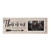 This Is Us Photo Frame Sign is a horizontal wooden sign with a distressed gray background and a built-in picture frame. The sign reads "This is us", "our life", "our story", "our home" in black and gray letters with black arrow art underneath. The background of the sign mimics worn shiplap and the frame is highlighted with a white border. This sign is built for a tabletop leaning display, using the wooden peg (included) to support the back of the piece. The picture frame houses a 4"x6" photo and the sign measures 5" high by 15.5" wide by .5" deep.