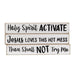 The Thou Shall Not Try Me Mini Sticks are an assortment of three decorative miniature wooden blocks with a white painted finish and natural worn edges. The blocks feature brushed black lettering and read "Thou shall not try me", "Jesus loves this hot mess", or "Holy Spirit activate". These sticks make a humorous everyday addition to the home, perfectly fitting on a riser, tray, or tabletop. Each block measures 1" high by 6" wide by .5" deep. Please note: This Item features a variety of designs which are each sold individually (not as a set). Please add a note in your cart to indicate your preference.
