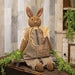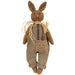 Ticking Patch Carrots for Sale Bunny Doll is a decorative plush doll made with primitive spring style. The doll features a sherpa texture and a detailed face created by buttons and embroidery. The bunny wears thick overalls with a ticking stripe pocket that reads "carrots for sale, 10c." Attached accessories include a raffia scarf and a stuffed carrot in the pocket. A weighted bottom allows the doll to sit freely on a shelf or tabletop edge. Measures 27" high by 11" wide by 3" deep.