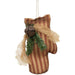 Ticking Stripe Mitten is a stuffed fabric ornament with a red ticking stripe pattern and mitten design. Mitten is accented by a jingle bell, greenery, and a distressed cheesecloth ribbon and it comes ready to hang by a string. Measures 6" high by 3" wide by 1.25" deep.