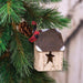 Tin Roof Star House Ornament is a wooden ornament with a painted and distressed finish and an old house design. Ornament has a brown tin roof with a white exterior and a spray featuring plastic greenery and a red and black buffalo check tie. It comes ready to hang by a metal wire hanger and measures 3.5" high by 2.75" wide by 1.75" deep.
