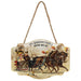 The To Grandmother's House We Go Vintage Embossed Metal Hanger is a decorative wall accent made with antique-inspired seasonal style. The metal sign features a painted-look depiction of a family riding a horse-drawn carriage through the woods in warm, rich hues. Black print across the top of the design reads, "to grandmother's house we go." A jute twine cord allows for easy hanging display. Measures 4.25" high by 6" wide by .125" deep.