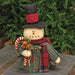 The Top Hat Candy Cane & Coat Snowman is a decorative winter plush with charming vintage style. The snowman has a fuzzy off-white fabric finish and a weighted bottom for freestanding display. He wears a green jacket, accented by a trio of rusted safety pins with jingle bells. A black felt top hat with a red band and a fringed red plaid scarf complete his ensemble. The snowman holds a yarn-wrapped candy cane decorated with burlap leaves and a cluster of rusted jingle bells. His face features beaded eyes, an orange carrot nose, and a tiny jingle bell smile for a friendly look. Measures 16” high by 6” in diameter.