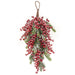 The Very Berry Icy Pine Drop is a decorative floral accent with a natural, brown-wrapped base. The piece features branches of textured pine greenery generously adorned with bright red berries, and covered with a thick snowy, icy coating. The top of the piece has a hanging loop to use for display on a door or wall, making a cheerful and festive touch to a wall or door during the Winter and Christmas season. Measures 28” long.
