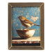 The Vintage Bird Bowl Framed Print is an elegant art piece encased in a wooden frame. Made with a detailed painted look, the print depicts a small bird standing on the rim of a clay bowl. The bowl rests on a heavily distressed wooden table, and weathered blue floral wallpaper serves as the background for the scene. A rustic brown stain and distressed finish give the frame a farmhouse look, and a predrilled keyhole hanger allows for easy display. The print measures 16” high by 12” wide, and the frame measures 17.5” high by 13.75” wide by .5” deep.