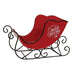 Vintage Red Metal Merry Christmas Sleigh is a tabletop decor piece with festive, vintage-inspired design. The sleigh features a bright red satin finish accented by black trim. A white design painted on each side reads, "we wish you a very merry Christmas." Measures 6.25" high by 5" wide by 11" deep.