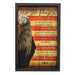 The We the People Framed Print accents Americana wall or shelf decor with bold design. Red and teastained stripes serve as the background of the print, complete with a rustic weathered finish. Half of a realistic bald eagle is depicted along the left side of the print. The preamble to the United States Constitution is displayed on the print in a mix of script and print black font. A trio of black stars sits below the text, which reads “we the people of the United States in order to form a more perfect union, establish justice, insure domestic tranquility, provide for the common defense, promote the general welfare, and secure the blessings of liberty to ourselves and our posterity, do ordain and establish this constitution for the United States of America.” The print sits in a thick black wooden frame. Measures 18” high by 12” wide by 2” deep.